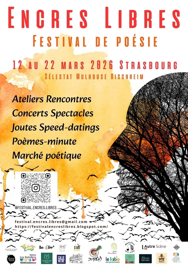 Tout le détail des évènements par date et par lieu est consultable directement sur notre site web : https://festivalencreslibres.blogspot.com/ DIVANOO à Bischheim Librairie DINALI Grand'Rue à Strasbourg CSC les Bateliers à Strasbourg Le Lerchenberg à Mulhouse Librairie la TACHE NOIRE à Strasbourg La MIMINE à Strasbourg L'Autre Scène à Sélestat SPEAKER à Strasbourg Le FEC à Strasbourg Librairie LE FIL ROUGE à Strasbourg Le Blue Note Café à Strasbourg La Tour Merveilleuse du SCHLOESSEL à Strasbourg Les Jardins de la Montagne Verte à Strasbourg