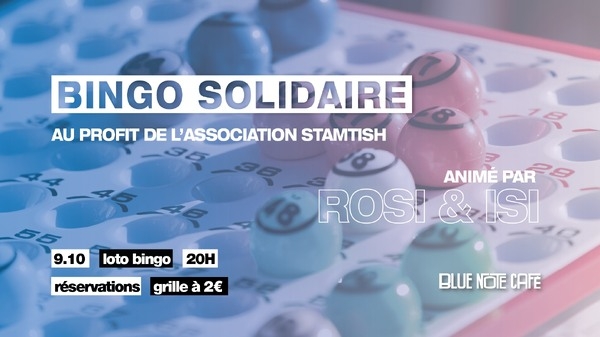 Rosi & Isi vous donnent rendez-vous pour un nouveau grand Bingo au Blue Note ! ? Un bingo hybride, ponctué d'intermèdes diaboliques et mini-jeux de culture de la pétoche. Mais surtout un moment pour boire un coup, manger un bout et s’amuser, tout en tentant de gagner des cadeaux, du petit goodies aux gros lots au profit de l'association Stamtish ? ─── [ ?? FONCTIONNEMENT ? ] ─── Fonctionnement : des boules numérotées sont tirées au long de la soirée, et plusieurs formations de bingo ainsi que des jeux sont proposés pour tenter de gagner les lots mis en jeu. Chaque participant peut acheter une ou plusieurs grilles sur place. 2€ la grille / 10€ les 6 grilles cash only ──── [ ? INSCRIPTION ? ] ───── Inscription : La participation est soumise à une inscription préalable afin d'organiser le jeu. Par mail à programmation@bluenotecafe.fr avec votre nom et le nombre de grilles que vous prévoyez d'acheter. Place limitées, inscription obligatoire. ─── Au profit d'une association locale : Stamtish, inspirée de l'alsacien "tablée conviviale", est née à Strasbourg en avril 2019. Chaque année, de nombreuses personnes sont contraintes de quitter leur pays à cause de persécutions, de conflits politiques ou de violations de leurs droits fondamentaux tels que l’accès au logement, à l’éducation ou à l’eau potable. Stamtish facilite l’inclusion sociale et l’insertion professionnelle des personnes issues des migrations par la cuisine.