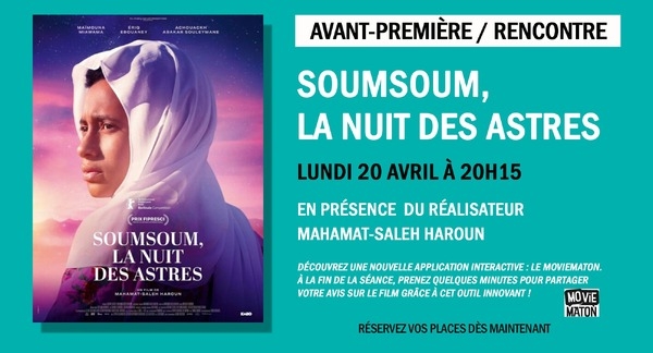 En présence du réalisateur Mahamat-Saleh Haroun ///////////////////////////////////////////// SOUMSOUM, LA NUIT DES ASTRES MAHAMAT-SALEH HAROUN - (FR + TD) - 2026 - VOST - 1h41 Dans un village isolé du Tchad, Kellou est traversée par des visions qu'elle ne comprend pas. Grâce à sa rencontre avec Aya, une exilée aux secrets douloureux, elle va découvrir une autre façon de regarder son passé, ses rêves et son village. Mais en prenant la défense d'Aya, que le chef du village tente de chasser, elle se heurte à la peur et à la colère des habitants, et devra se battre pour garder sa liberté.