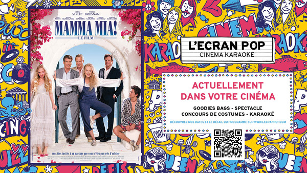 L'Ecran Pop - Mamma Mia ! Vendredi 10 octobre à 20h au Cinéma Vox Envie de t'évader en Grèce ? L'Ecran Pop Cinéma-Karaoké t'emmène sur la petite île de Kalokairi à la rencontre de la douce Sophie et de l'extravagante Donna pour 2h30 de fun ! .... Redécouvre "Mamma Mia !" et prouve tes talents de chanteur avec un karaoké des chansons cultes du film. Inutile de connaître les paroles, elles défilent sur l’écran lors de la diffusion du film ! Un seul mot d’ordre : emporte ta bonne humeur et toute ton énergie pour participer à cette expérience festive et amusante. Animée par un maître de cérémonie, cette soirée s'annonce pleine de surprises avec des goodies, des cadeaux à gagner et même un concours de costumes ! Il ne te reste plus qu’à dire thank you for the music et à assumer ton nouveau statut de dancing queen. Car ici, tout est permis, surtout les strass et les paillettes ! Prends tes billets pour L'Ecran Pop Cinéma-Karaoké : Mamma Mia ! à Strasbourg ! .... AU PROGRAMME ? Une pochette pleine de surprises offerte pour participer durant la séance et la rendre un peu plus colorée et déjantée ? Un maître de cérémonie pour faire monter la température et gagner plein de cadeaux ✨ Enfile ta plus belle tenue des 70’s et participe au concours de costumes ? Redécouvre le film "Mamma Mia !" et participe à un karaoké en direct avec les paroles des chansons cultes qui défilent sur l'écran