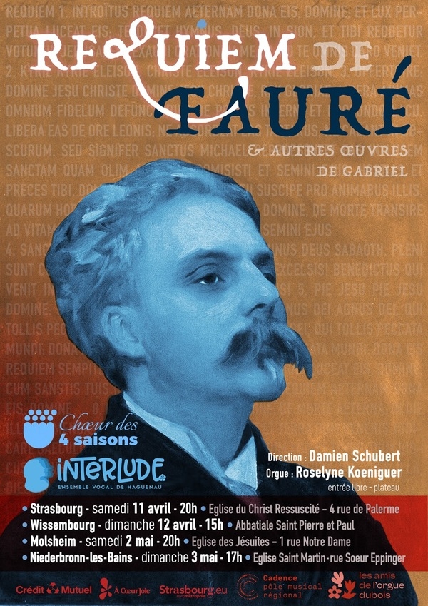Au printemps 2026, l’Alsace vibrera au son de l’une des œuvres les plus lumineuses du répertoire français. L’ensemble vocal INTERLUDE de Haguenau et le Chœur des 4 saisons de Strasbourg Robertsau s’associent pour une tournée de plusieurs concerts consacrés au Requiem de Gabriel Fauré, une partition emblématique dont la douceur et la profondeur continuent de toucher les publics depuis plus d’un siècle. Sous la direction de Damien Schubert, chef de chœur des deux ensembles, près de 80 choristes uniront leurs voix pour offrir une interprétation fondée sur la clarté du texte, l’équilibre des pupitres et la transparence des timbres. Une approche fidèle à l’esprit de Fauré, qui voyait dans son Requiem non pas une fresque dramatique, mais une « berceuse de la mort », empreinte de recueillement et de lumière. Le baryton Jean Moissonnier assurera la partie soliste, tandis que l’organiste Roselyne Koeniguer accompagnera l’ensemble. La partie soliste soprano sera assurée par quelques voix issues du chœur Interlude. Un programme entièrement dédié à Fauré Avant le Requiem, d’une durée d’environ 35 minutes, les choristes proposeront plusieurs pages sacrées du compositeur : Tu es Petrus, Ave verum corpus, Maria Mater Gratiae, ou encore la célèbre Pavane et le Madrigal. Un panorama qui permettra au public de redécouvrir la richesse et la diversité de l’écriture fauréenne. Deux chœurs alsaciens engagés et complémentaires Anciennement connu sous le nom de "Chorale des Enseignants de Haguenau", l’ensemble vocal INTERLUDE rassemble 48 choristes amateurs confirmés. Habitué à alterner spectacles mis en scène et concerts classiques, il s’est récemment illustré avec Queen & Kings of Pop (2025) et Voyage en polyphonie (2023). Le CHŒUR DES 4 SAISONS, créé en 1984 à la Robertsau, est quant à lui un acteur régulier de la vie musicale strasbourgeoise, notamment lors de « Strasbourg, capitale de Noël ». Affilié au mouvement A Cœur Joie, il se distingue par son ouverture à des projets variés, du caritatif à l’événementiel.