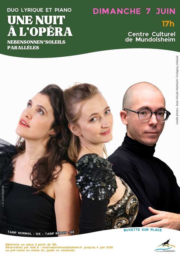 Après le succès de « De Vienne à Broadway » en 2024, la compagnie Nebensonnen*Soleils Parallèles revient avec un nouveau projet réunissant artistes professionnels et jeunes talents locaux. Ce spectacle vous emmène au royaume de l’Opéra pour un voyage musical de pays en pays, à la découverte des émotions les plus passionnées. Le duo lyrique, formé par la soprano Milena Bischoff et la mezzo-soprano Belinda Kunz, interprétera de magnifiques airs d’opéra accompagnées par le pianiste virtuose Valentin Mansard. Ils seront rejoints sur scène par les enfants et les jeunes du périscolaire de Mundolsheim pour plusieurs chœurs extraits du répertoire italien (Madama Butterfly), français (Carmen) et allemand (Hänsel et Gretel). En écho aux voix, Valentin Mansard proposera également des pages virtuoses au piano inspirées de thèmes d’opéras célèbres.
