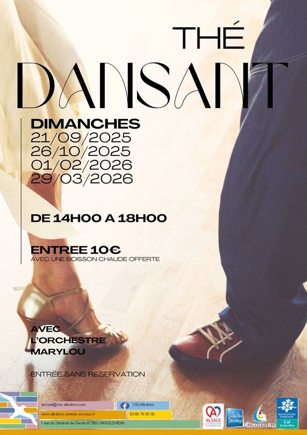 La magnifique salle de spectacle de l’Albatros vous accueille régulièrement, en partenariat avec la ville de Lingolsheim. Ouverts à tous, les thés dansants accueillent un public amateur de jolies mélodies interprétées par l’excellent orchestre Marylou. Valses, marches, tangos, madison, twist, rock-and-roll, tcha-tcha-tcha, samba; ce vaste répertoire anime et enchante un public connaisseur. La piste ne désemplit que pendant les pauses qui sont l’occasion pour les bénévoles de proposer à leurs hôtes pâtisseries et rafraîchissements. Ce moment de bonne humeur plébiscité par un public fidèle est l’occasion de retrouver des connaissances ou d’en faire et de ressentir les bienfaits de la musique et de la danse.
