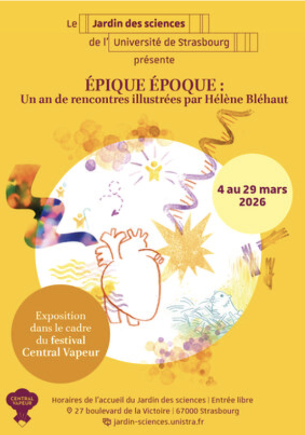 "Épique Époque" réunit mensuellement, au Planétarium du Jardin des sciences, plusieurs scientifiques de disciplines différentes autour d’une question de société. Hélène Bléhaut a illustré ces échanges lors de l’année universitaire 2024-2025. Cette exposition revient sur sept éditions, par le biais d’un travail que l’on appelle la facilitation graphique. Elle a pour objectif de synthétiser les paroles des scientifiques par l’illustration : baisse des natalités, langage inclusif, biais cognitifs ou mécanismes du cancer...