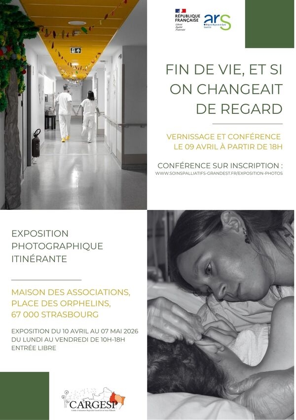 La Cellule d’Animation Régionale Grand Est de Soins Palliatifs (CARGESP) a le plaisir de vous inviter à la soirée inaugurale de l’exposition photographique itinérante : « Fin de vie, et si on changeait de regard ? » Jeudi 09 avril 2026 à partir de 18h