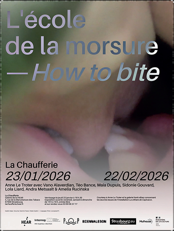 Anne Le Troter déploie La cithare de Capivacci dans l’espace de La Chaufferie : une installation sonore composée de quatre sculptures à mordre, réunissant des professionnel·les de la morsure pour montrer une « école de la morsure ». Avec les étudiant·es Vano Alaverdian, Téo Bance, Maia Dupuis, Sidonie Gouvard, Lola Liard, Andra Metsaalt et Amelia Rucińska. Dracula, Carmilla, Laurie Anderson, Guignol et Jimi Hendrix racontent comment mordre, pourquoi on mord et qui on mord. On mord la main pour qu’elle nous lâche, le pied pour qu’il fasse demi-tour, la langue pour qu’elle se retire. Chaque personnage tente une pédagogie poétique, encapsulée dans des sculptures végétales qu’on est invité·e à mordre, guidé·e par les médiateurices. Anne Le Troter prend appui sur le protocole médical de Hieronymus Capivacci, qui, au XVIe siècle, proposait à ses patient·es de croquer dans les cordes d’une cithare pour évaluer leur surdité, grâce à la conduction osseuse.