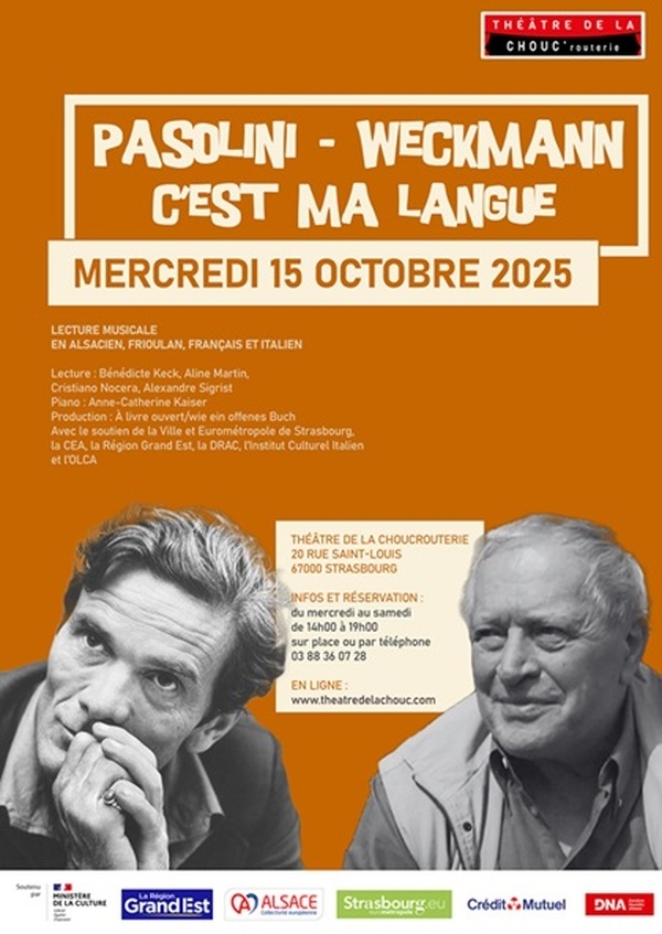 Leur dénominateur commun c’est l’engagement, leur arme la poésie. Contemporains l’un de l’autre (Pasolini nait en 1922, Weckmann en 1924), de la tragédie de l’Europe et du monde, englués dans les totalitarismes, témoins de l‘explosion de la société de consommation, ils se battent « en tant que poètes des choses » sans faux-semblants. « Wann em poet sini Sproch sterbt, si la langue du poète se meurt ». Mais s’ils sont partis, leurs mots restent vivants, et leurs langues parlent. Pasolini est mort assassiné le 2 novembre 1975. Zwei Poeten in Zeiten der Tragödie vom 2. Weltkrieg und ein selbes Engagement gegen Heuchelei in einer musikalisch untermalten, nmehrsprachigen Lesung. Lecture : Bénédicte Keck, Aline Martin, Cristiano Nocera, Alexandre Sigrist Piano : Anne-Catherine Kaiser Production : A livre ouvert/Wie ein offenes Buch Avec le soutien de la Ville et Eurométropole de Strasbourg, la CEA, la Région Grand Est, la DRAC, l’Institut Culturel Italien et l’OLCA.