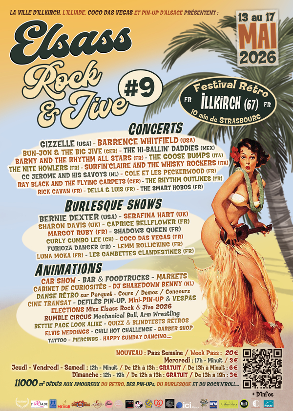 Les amoureux des années 50 vont être au paradis ! Un village rétro avec des stands (habits, déco et accessoires rétro), tatouages, barbier, car show, défilés de Pin-up, élection de Miss Pin-up Elsass Rock & Jive 2026, mais aussi et bien sûr, des concerts, des shows burlesques, des cours de danses rétro, un DJ rétro et bien d’autres animations…