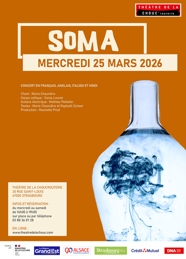 Le groupe Soma est né de l’envie de Marie Chauvière de produire ses chansons sur scène. Pour cela, elle s’est entourée des musiciens Sonia Louvet et Mathieu Pelletier. Leur musique mêle chant, harpe celtique et guitare électrique. Elle nous balade dans des atmosphères aériennes, souvent oniriques qui font la part belle aux textes. Les voix s’amusent avec les langues et nous racontent la difficulté de dire, la nature, les relations amoureuses, les cycles et les rythmes de la vie…