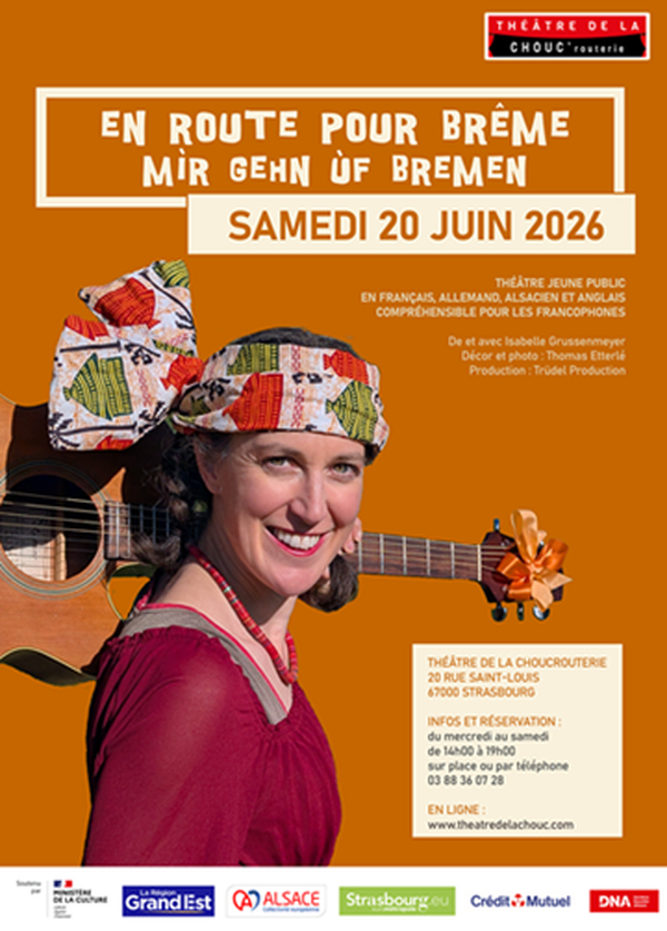 Un âne, un chien, un chat, un coq… chassés par leurs maîtres respectifs, décident de commencer une nouvelle vie. Ils s’en vont sur les chemins pour rejoindre la ville de Brême en Allemagne pour devenir musiciens ! Dans ce spectacle vivant interactif, Isabelle Grussenmeyer revisite le conte des frères Grimm en passant d’une langue à l’autre.
