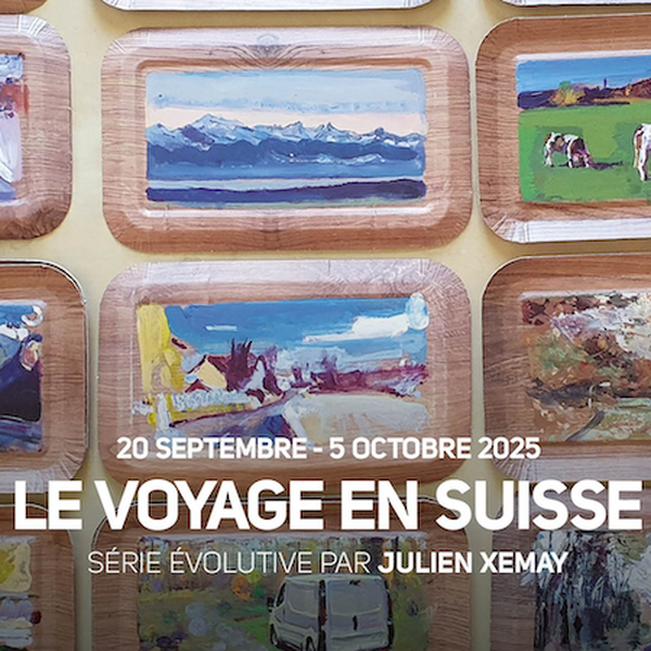 LE VOYAGE EN SUISSE. Il y a un support qui joue au tableau : une barquette - faux plateau de bois - dans son cadre mouluré. Le petit format est utilisé de manière sérielle et le peintre applique ses acryliques sur le film plastique d’emballages récupérés. Ces produits destinés à la grande consommation deviennent objets d’art par le geste et le regard de celui qui les choisit. Avec Le voyage en Suisse commencé en 2020, il renoue avec sa propre démarche : c’est une forme de liberté qu’il fait défiler sous nos yeux. Il ne s’agit pas d’un arrêt sur des images mais bel et bien d’un départ vers un réel imaginé. Voitures, camionnettes, parkings, autoroutes, ronds-points, maisons de lotissement, etc. tout ce qui constitue l’espace public devient un sujet de prédilection. La photographie est ici un outil, comme Vermeer avait une boîte noire à travers laquelle regarder. La peinture rend l’image sensuelle, c’est un lieu stimulant où matière couleur sujet se combinent. La collection de ces petites images peintes offrent non sans humour l’idée d’un monde en expansion. Julien Xemay est issu des Arts Décoratifs de Strasbourg, il exerce depuis trente ans le métier de restaurateur de peintures, ce qui l’a amené du côté de l’attention visuelle, d’une variété de savoir-faire picturaux, une connaissance nourrie de l’histoire de l’art.