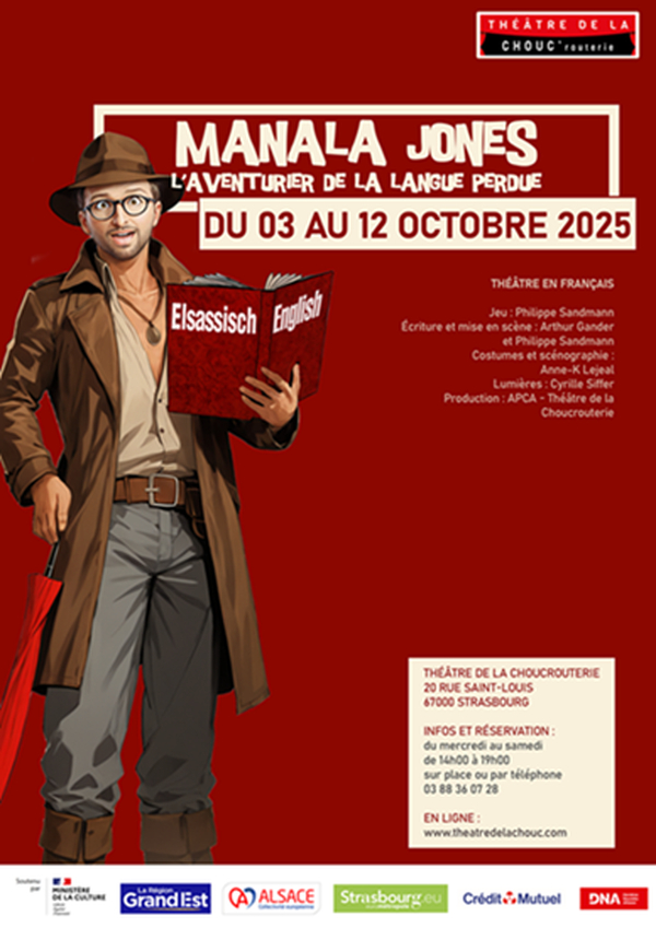 Le célèbre Manala Jones est 50% prof de langue ; 50 % archéologue ; 100 % aventurier. Lorsqu’une mystérieuse organisation plus ou moins non gouvernementale lui confie une mission sur le mystère du dialecte alsacien, Manala Jones se doit de mener l’enquête. Parce que trop de mystères, il aime pas ça. Un spectacle pour que les Français puissent enfin comprendre l’alsacien et que les Alsaciens comprennent enfin autre chose que leurs voisins.